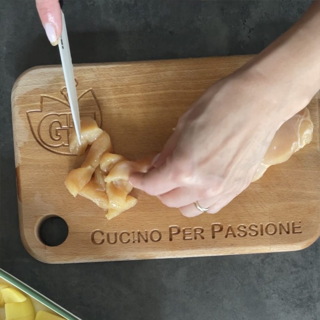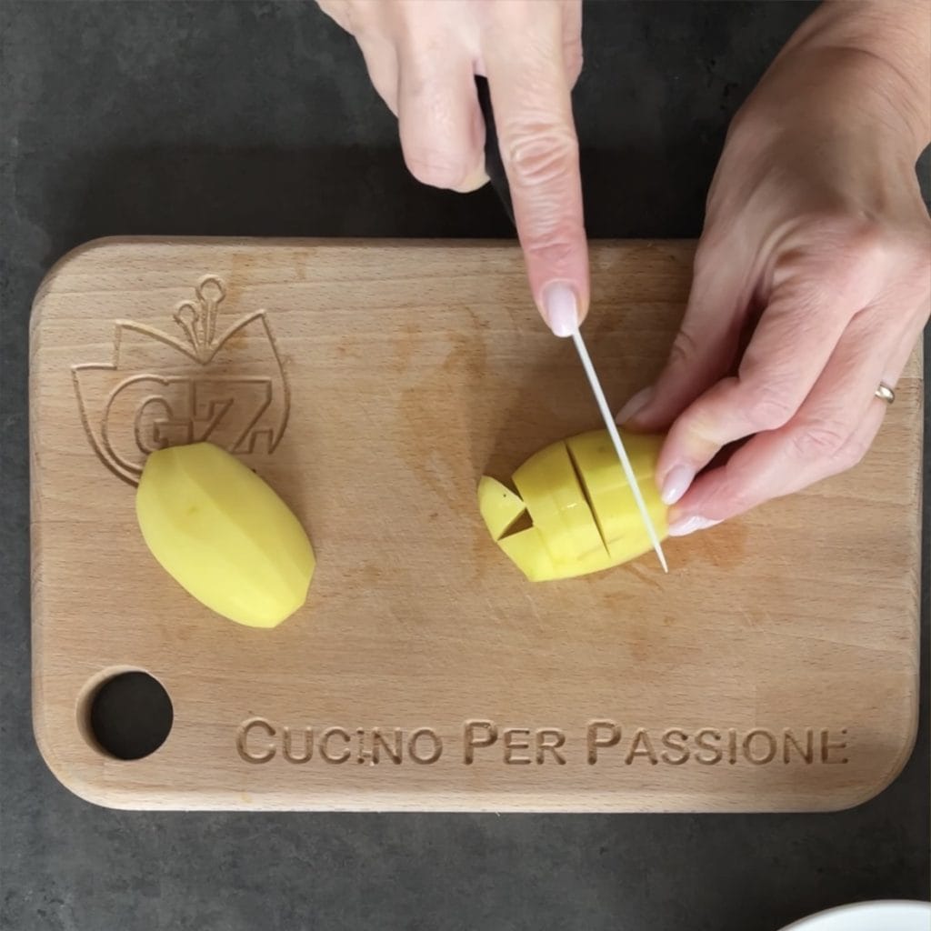 en snijd het in stukken van dezelfde grootte als de aardappelen.