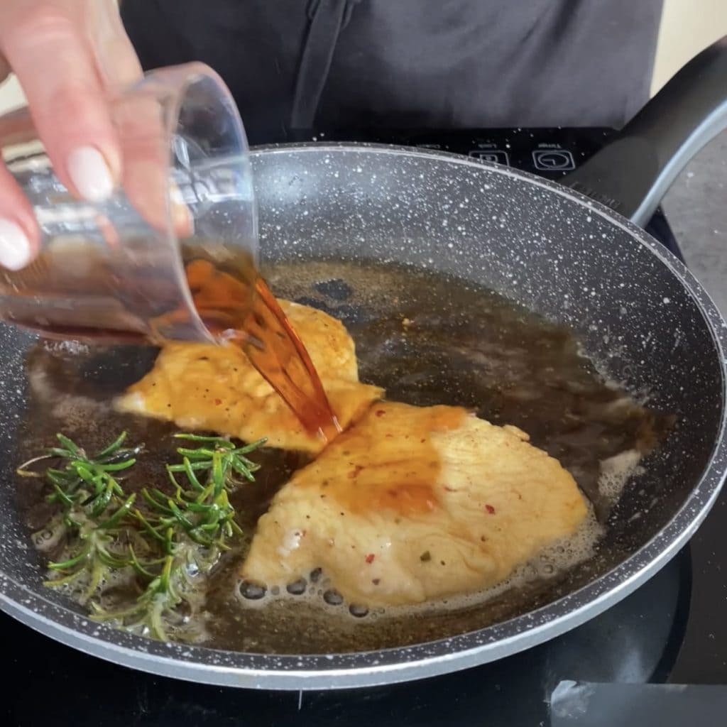 blus af met de marsala en laat de alcohol verdampen, kook de kipfilet in ongeveer 10 minuten gaar.