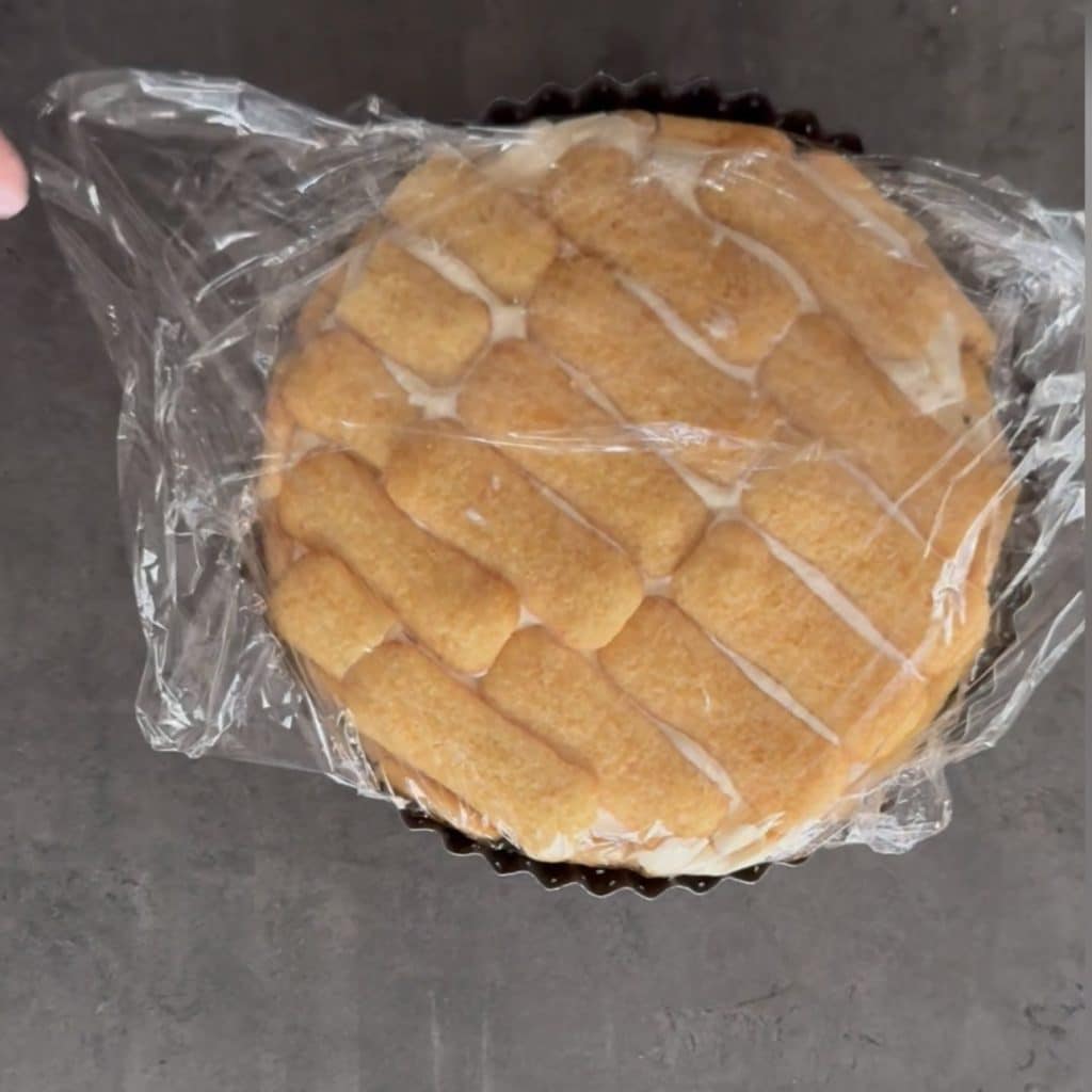 Bekleed de bakvorm met plastic folie en plaats de pavesini op de bodem en aan de randen, nadat je ze eerst in het aardbeiensap hebt gedoopt.