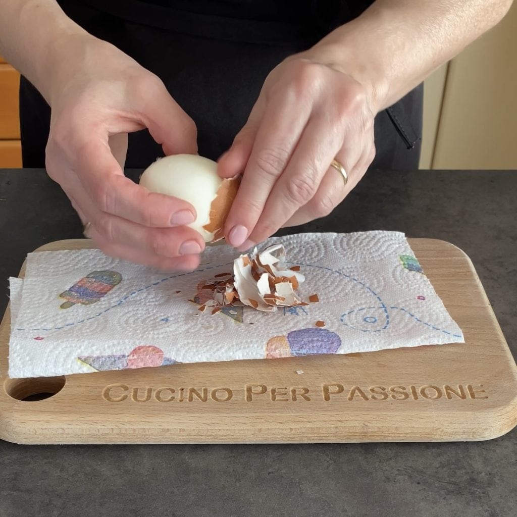• Laten we beginnen met het bereiden van de Koude pasta met eieren en tonijn. Plaats de eieren in een pan met water en kook ze 7 minuten vanaf het moment dat het water begint te koken. Haal ze vervolgens van het vuur en laat ze afkoelen onder koud stromend water, dit zorgt ervoor dat ze gemakkelijk te pellen zijn.