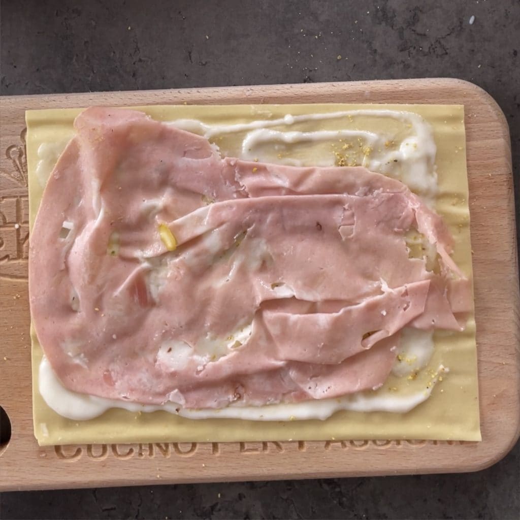 Neem een lasagnevel, smeer er bechamelsaus op en verdeel gelijkmatig, bestrooi met pistachekorrels,