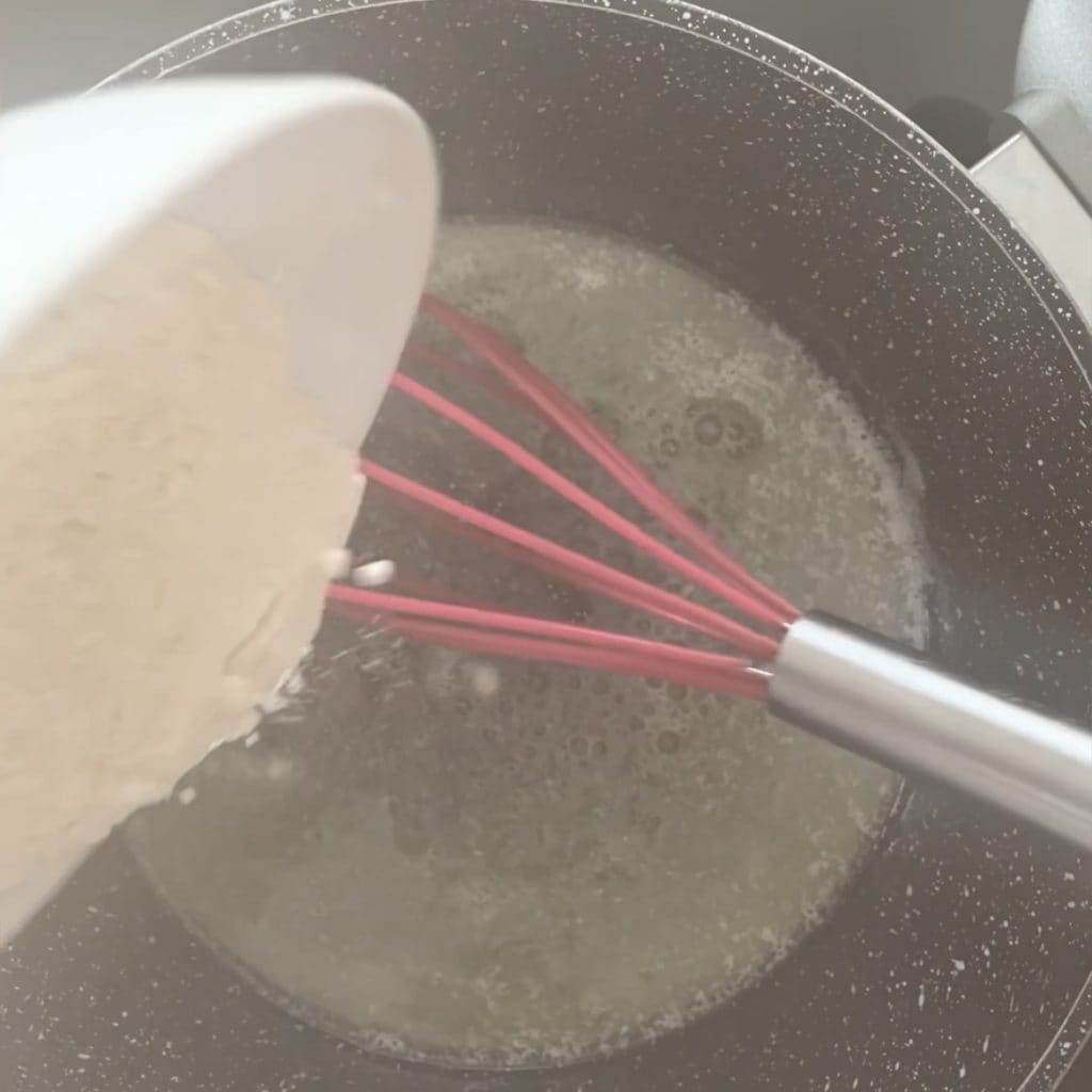 Als de boter gesmolten is, voeg je de bloem in één keer toe, roer met een garde en laat het opnemen. Laat een paar minuten op het vuur, terwijl je blijft roeren.