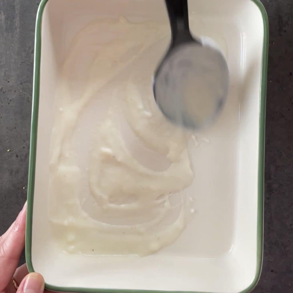 Giet een laag bechamelsaus op de bodem van de ovenschaal.