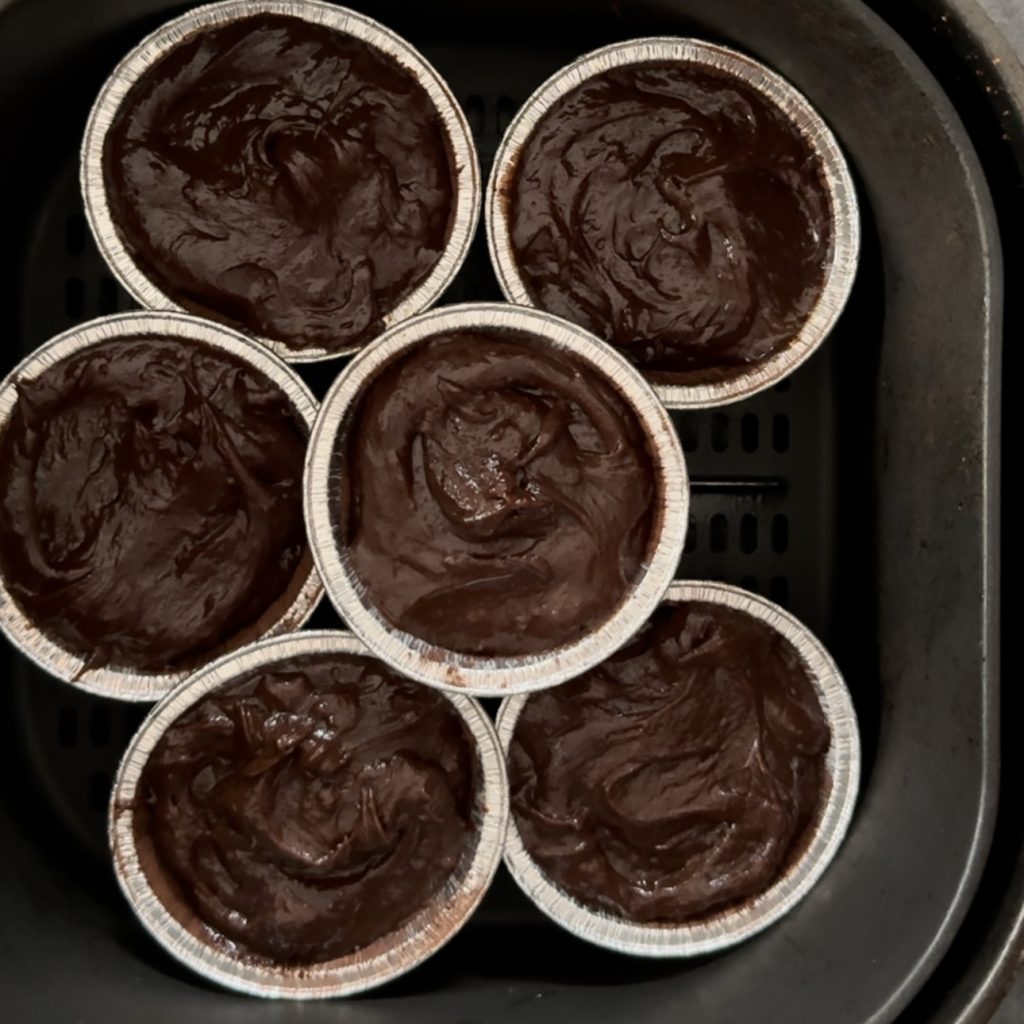 • Vet de bakvormpjes in en bestrooi ze met cacaopoeder, zodat ze later gemakkelijk loskomen, giet het mengsel in de 6 bakvormpjes en plaats ze in het mandje van de airfryer. Bak ze op 180°C gedurende 9 minuten.