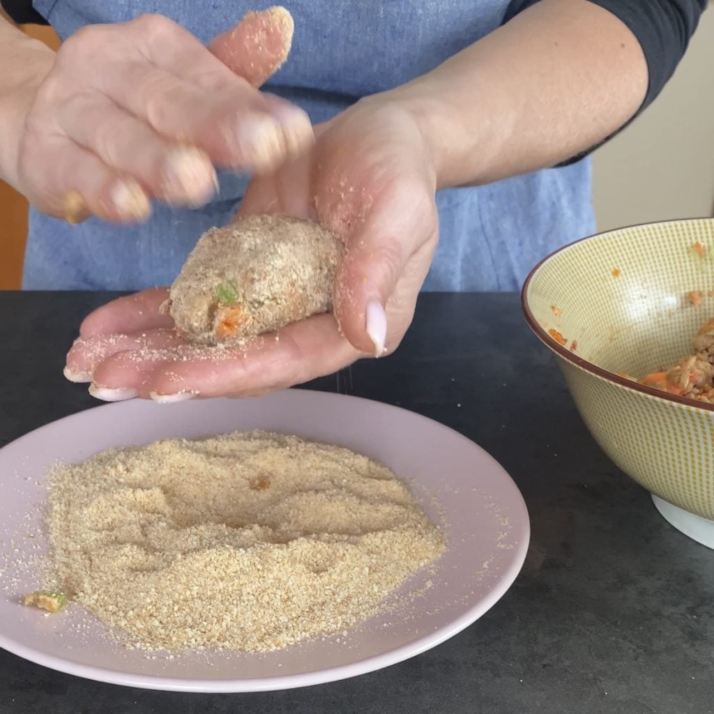 Neem met je handen wat van het mengsel en vorm de balletjes, rol ze door het paneermeel, plat ze iets en ga zo verder tot alles op is.