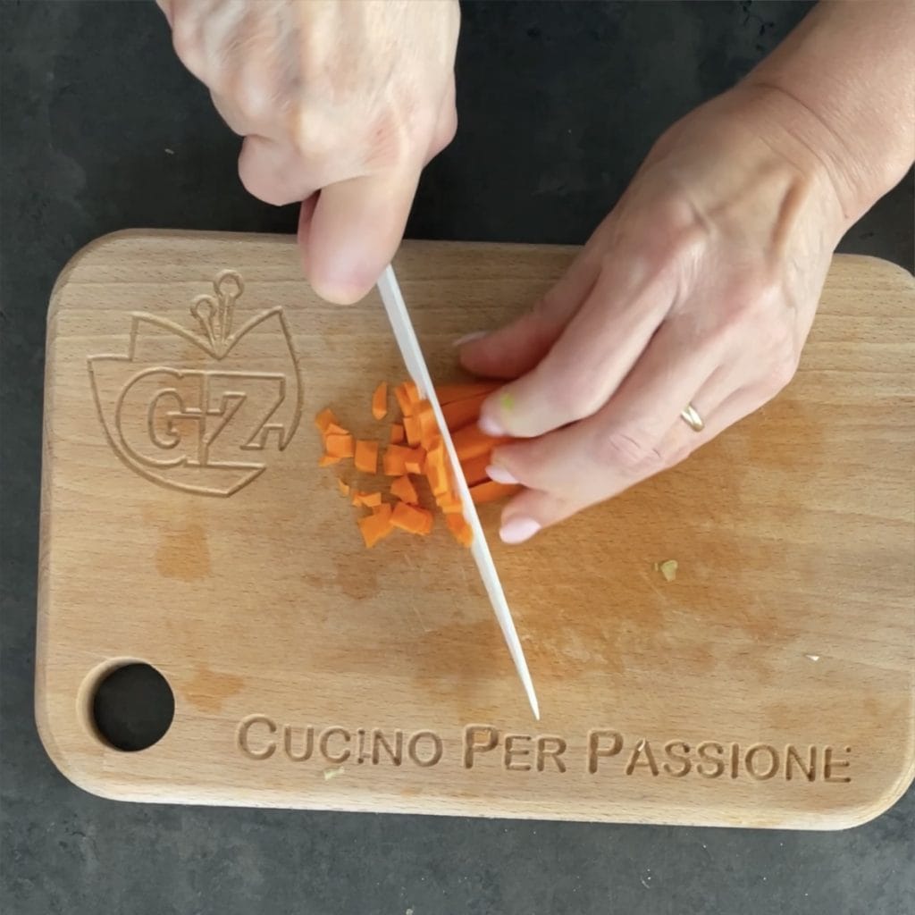 Laten we beginnen met het maken van de linzenballetjes. Was eerst de wortels en de bleekselderij. Kook één wortel of stoom deze, afhankelijk van uw voorkeur. Hak de bleekselderij fijn,