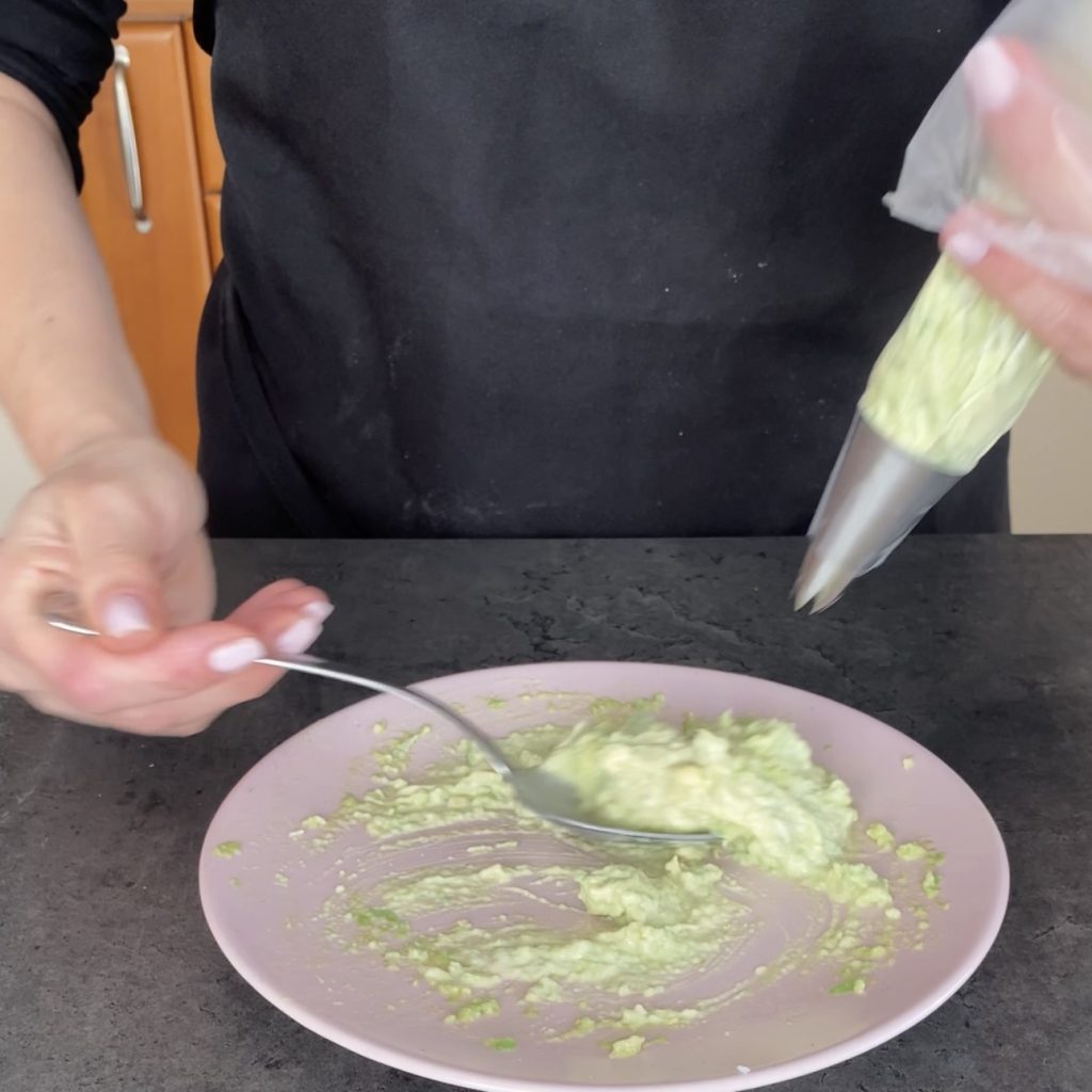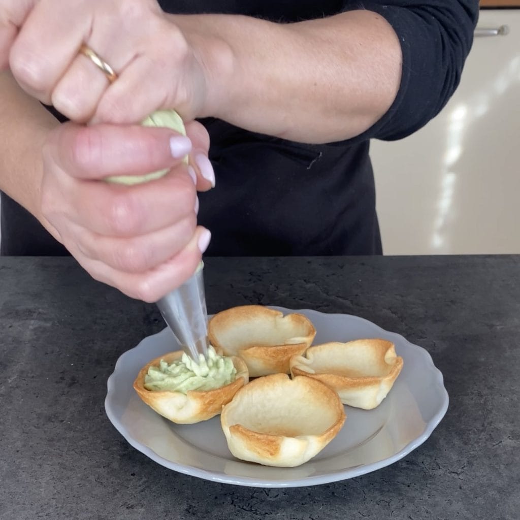 Vul de mandjes van korstdeeg met de avocadosaus,