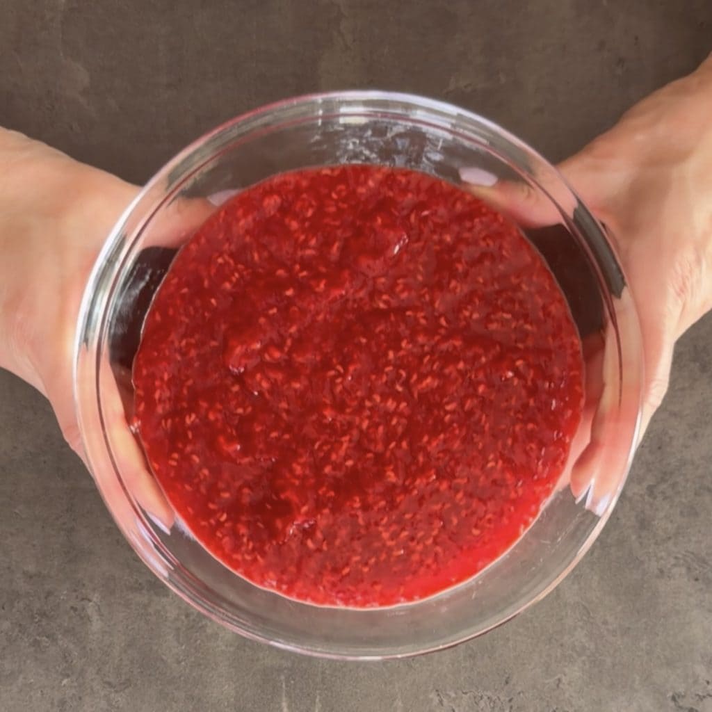 Nu de melkpudding klaar is, ga je verder met het maken van de frambozensaus. Giet in een kommetje het maïszetmeel en het water en roer met een lepeltje zodat het zetmeel oplost, zet het apart.