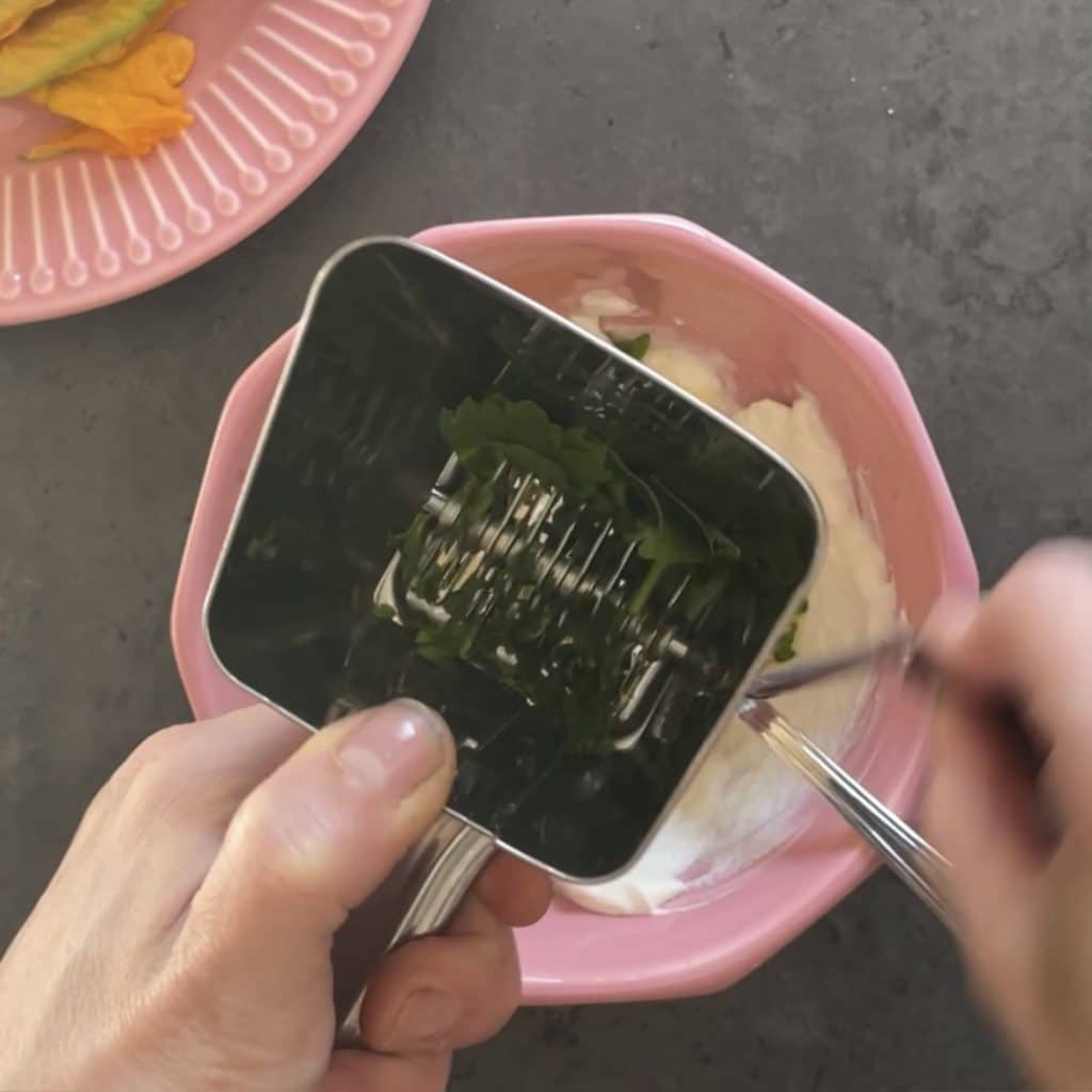 Was de courgettebloemen snel onder stromend water en dep ze voorzichtig droog met een stukje keukenpapier, verwijder de steel en de uitsteeksels aan de basis, verwijder het binnenste stamper door de bloemen voorzichtig te openen, grijp de stamper met twee vingers en draai de bloem, op deze manier komt de stamper gemakkelijk los zonder de bloem te breken.