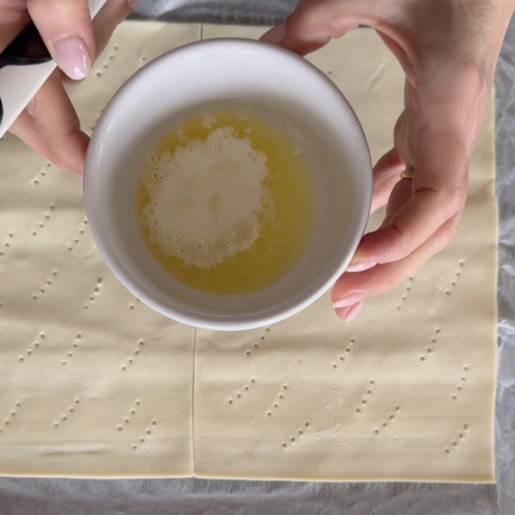 • Leg een stuk bladerdeeg op het serveerbord en breek met een vork de grotere luchtbellen indien aanwezig.
