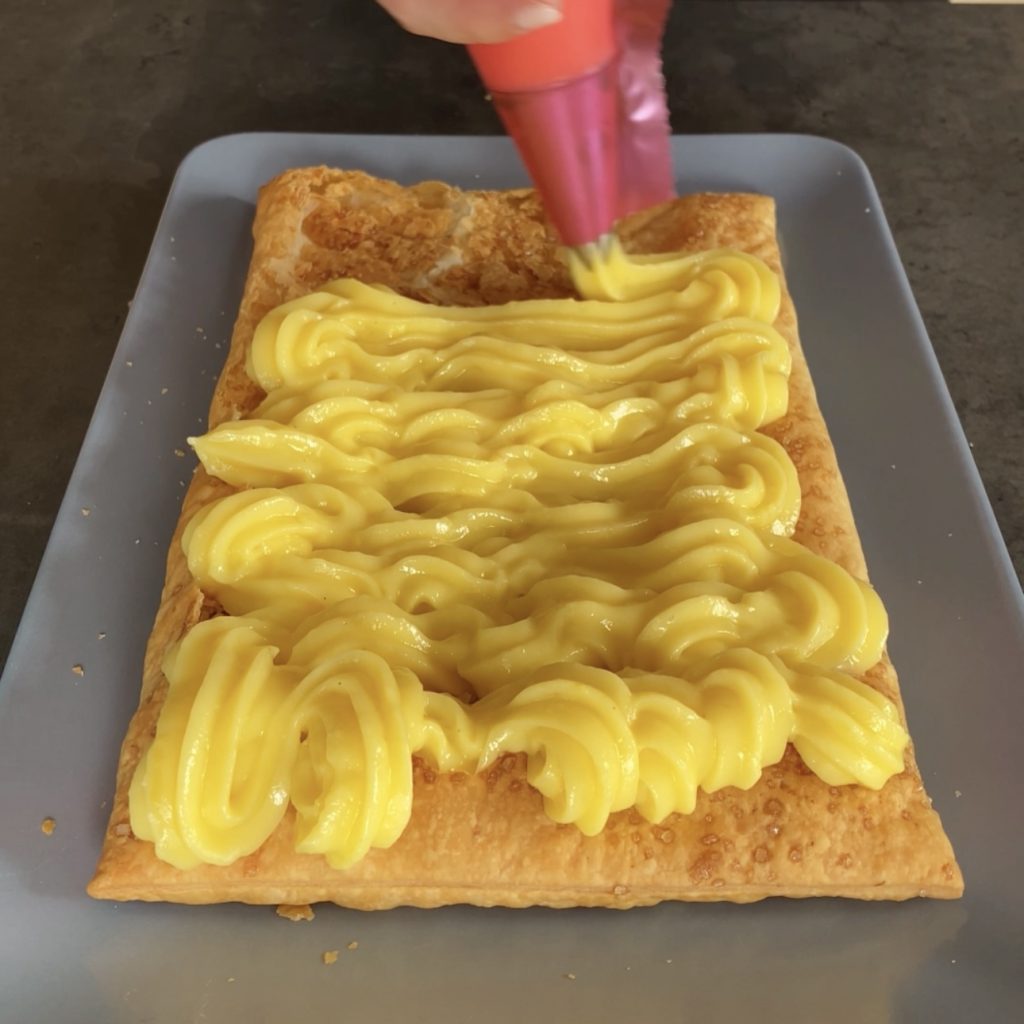 • Nu alles klaar is, kunnen we de Millefeuille met aardbeien assembleren. Haal de room uit de koelkast en werk het met een lepel om het romig te maken, plaats het in een spuitzak met een stervormige spuitmond.