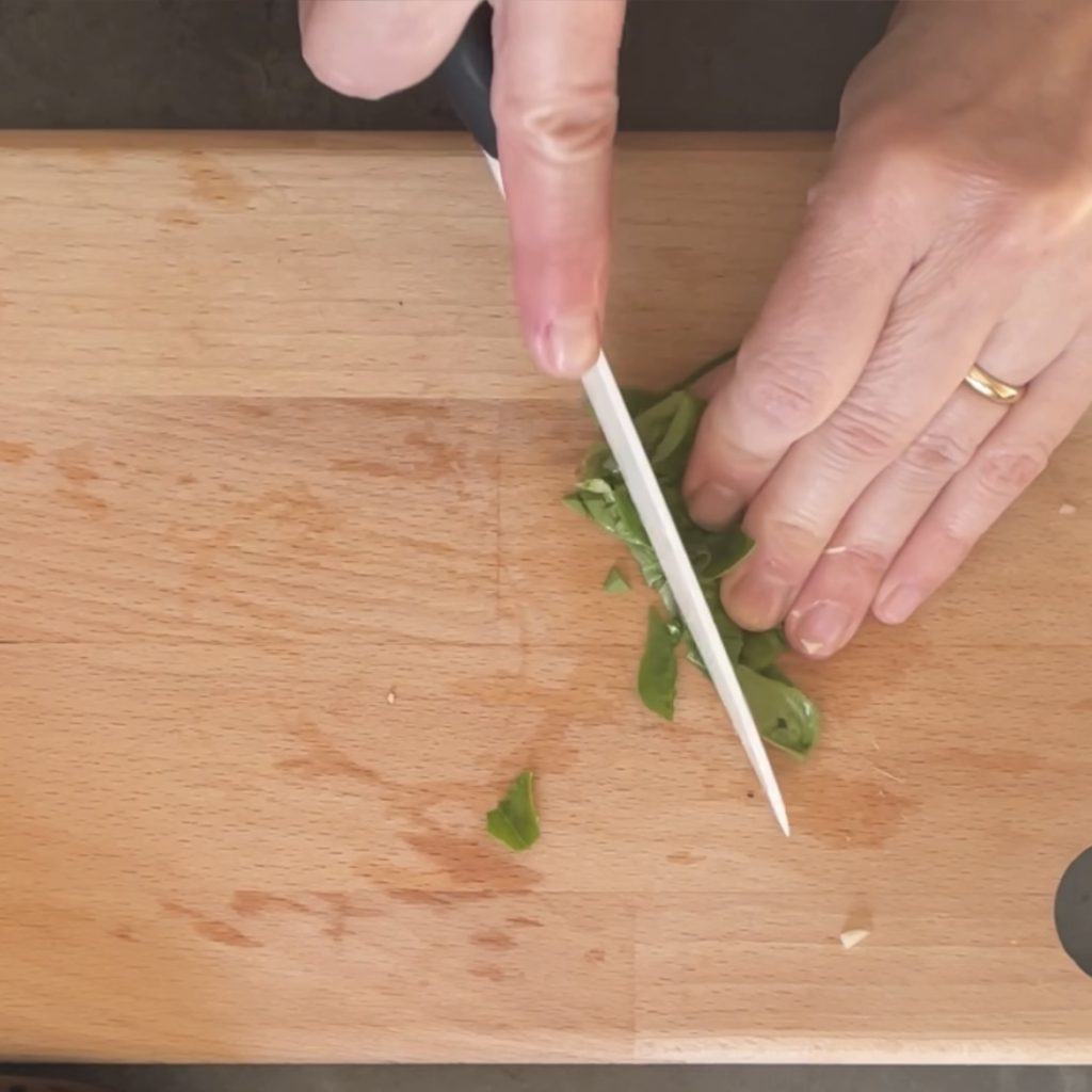 • Laten we beginnen met het bereiden van de aubergine gehaktballen door de knoflook fijn te hakken,
