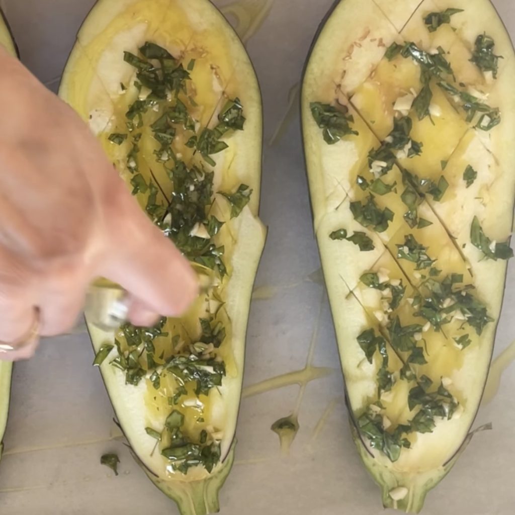 • bekleed een bakplaat met bakpapier en leg de aubergines erop, giet de olie en het mengsel van knoflook, peterselie en basilicum over de aubergines, spreid de inkepingen uit zodat de smaak in de inkepingen van de aubergines kan trekken.