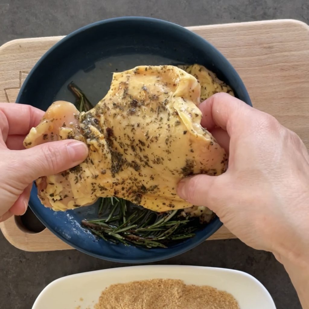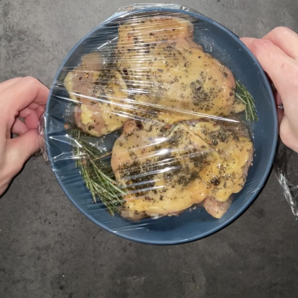 Draai de kippenbouten meerdere keren in de marinade en dek de kom vervolgens af met plasticfolie. Zet de kom 6–8 uur in de koelkast of, nog beter, de hele nacht.