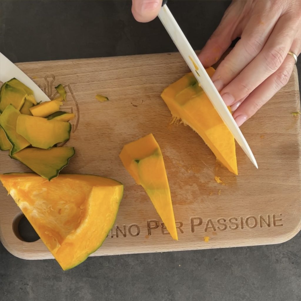 We beginnen met het bereiden van ovengeroosterde pompoen met speck. Snijd de pompoen, verwijder de zaden en de binnenste draden en schil hem ook,
