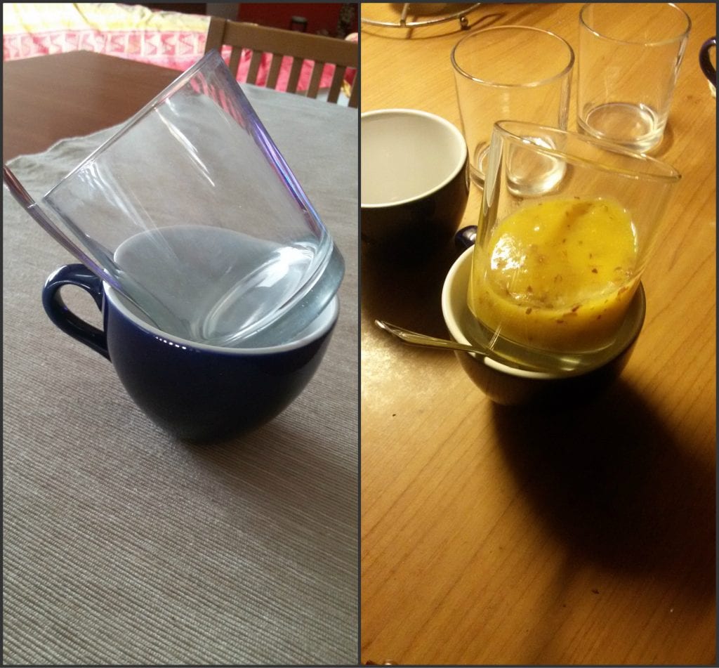Voeg nu de gelatine met suiker toe aan de gepureerde perziken en meng goed. Plaats de glazen schuin (zoals op de foto), ik raad aan een theelepel tussen het kopje en het glas te leggen zodat het glas niet kan wegglijden. Verdeel de perzikpuree en zet het 4 uur in de koelkast zodat de gelatine kan stollen.