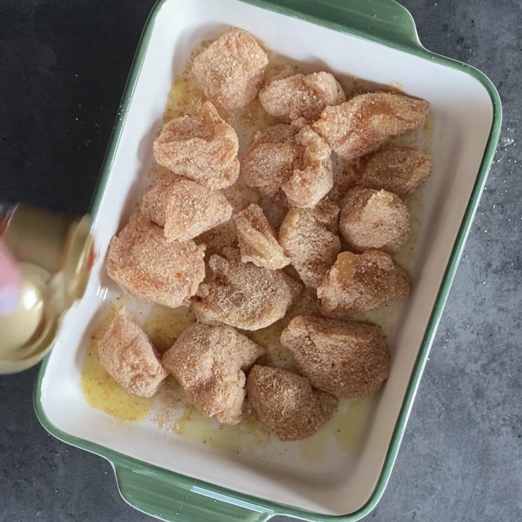 We beginnen met het voorbereiden van de paprika kip nuggets, verwijder eventuele botjes en vet van de kipfilet en snijd deze in stukjes,