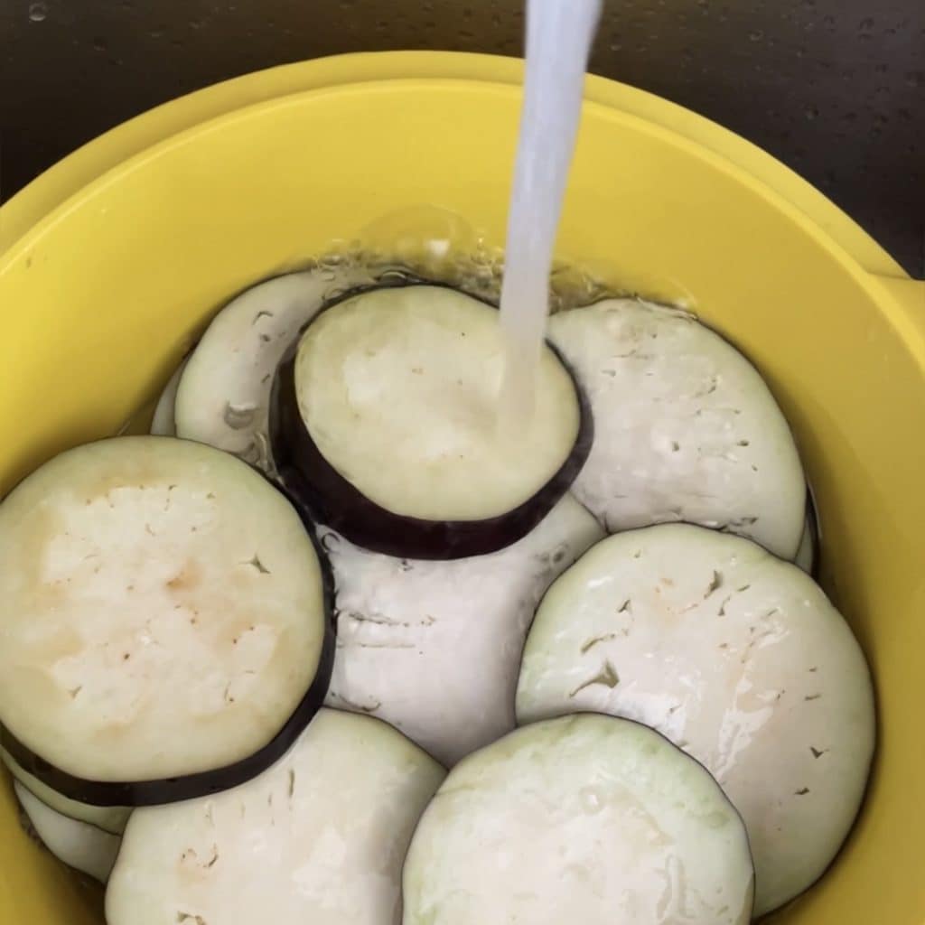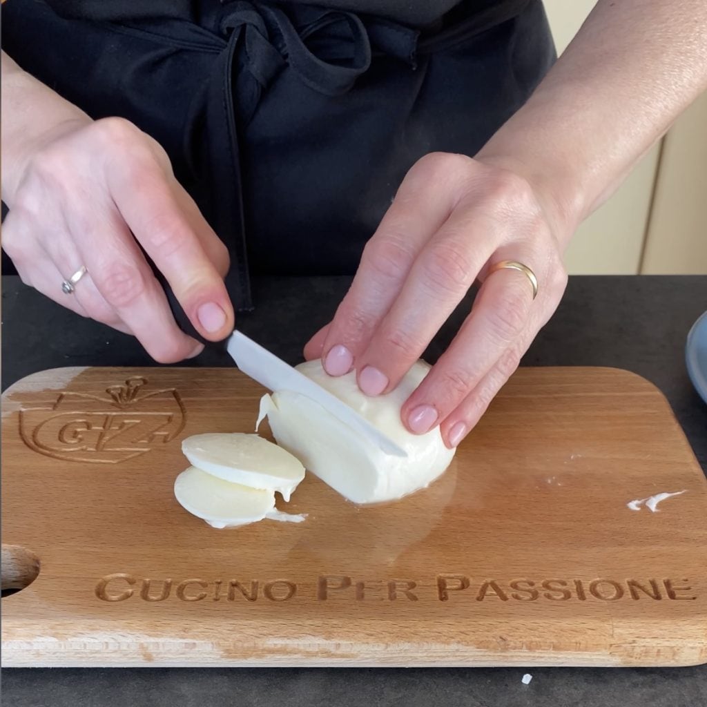 Snijd de mozzarella in plakjes en laat ze rusten, zodat het vocht eruit kan en de parmigiana steviger wordt en je het vervelende vocht niet vindt.