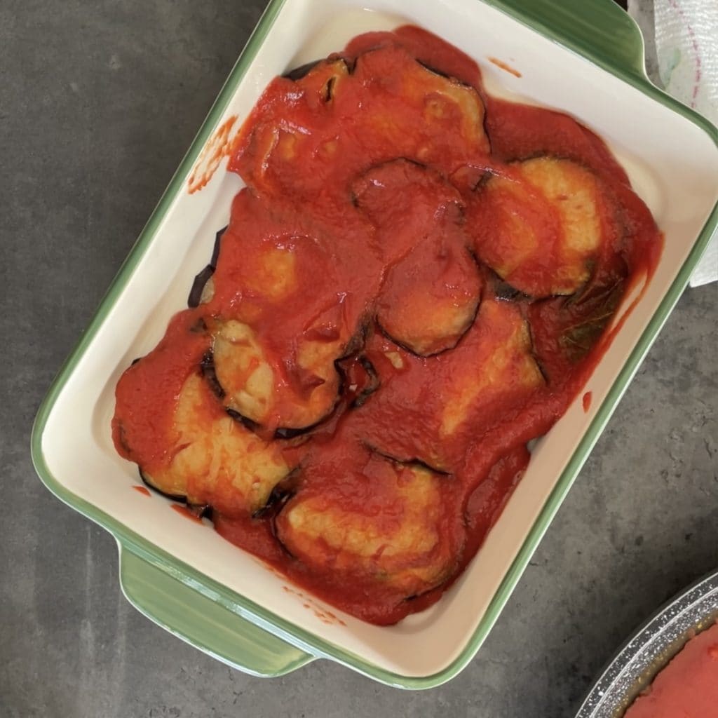 Ga op deze manier verder met het maken van andere lagen van aubergines, passata, basilicum, mozzarella en kaas, totdat de parmigiana compleet is,