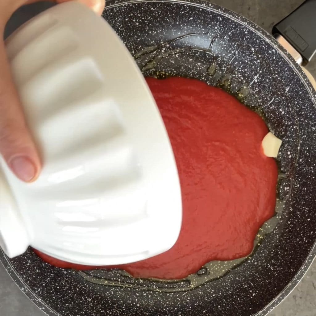 giet de tomatenpassata erover en verdeel het over de aubergines,
