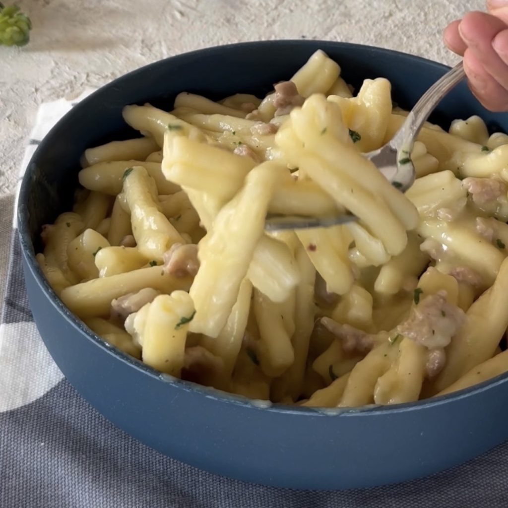 Hoe de pasta met aardappelcreme en worst te bereiden