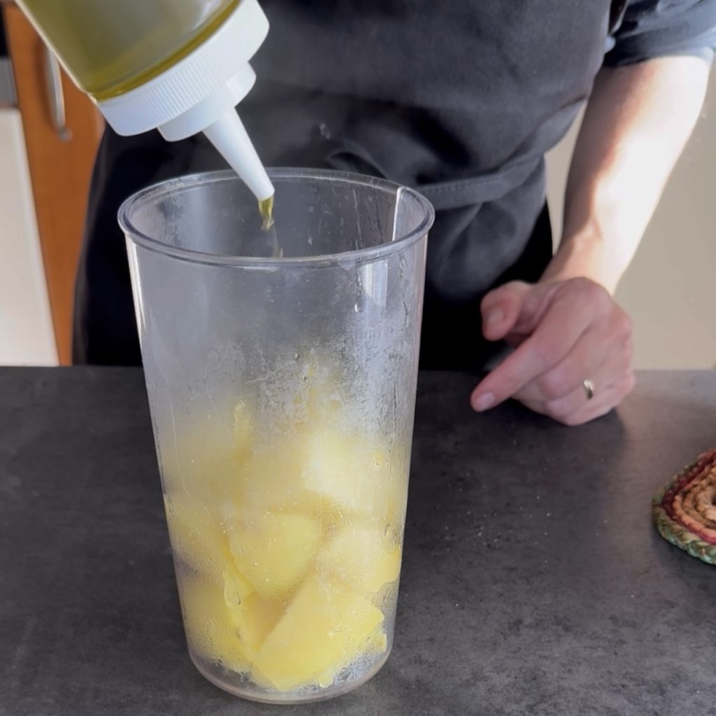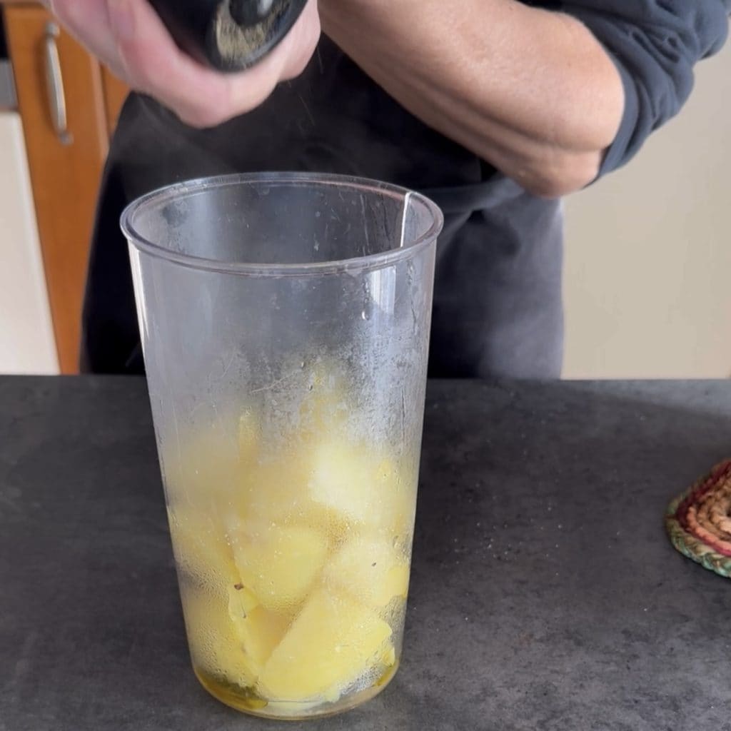 Doe de gekookte aardappelen in de beker van de staafmixer,