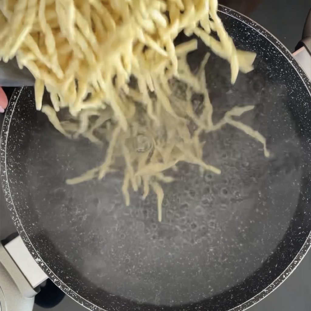 en laat ze koken volgens de tijd aangegeven op de verpakking. Als de pasta klaar is, giet deze af en voeg ze toe aan de pan met de aardappelstukjes,