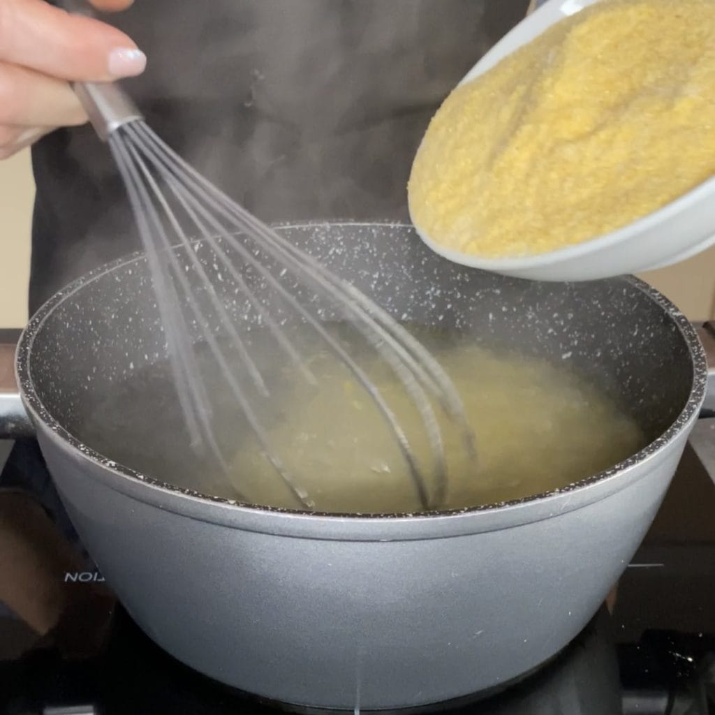 Als de radicchio klaar is bereid je de polenta, giet het water in een pan, en als het kookt voeg je het zout toe,
