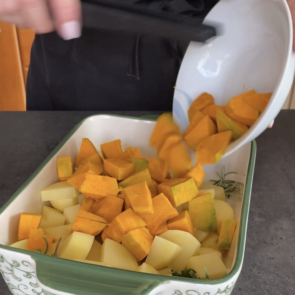 snijd het vervolgens in kleine stukjes zoals de aardappelen. Zet de statische oven op 180°, zodat deze de temperatuur kan bereiken.