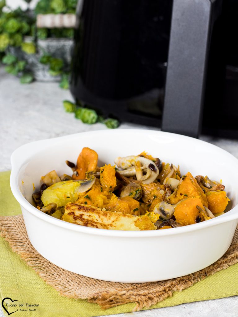Pompoen en aardappelen in airfryer een bijgerecht eenvoudig en smakelijk, je kunt ook gesauteerde champignons toevoegen die het gerecht nog lekkerder maken. Ik ben dol op pompoen en in de herfst maak ik veel recepten zoals champignons, een ander cadeau van de herfst, ik gebruik ook eenvoudige champignons of pioppini die het hele jaar door in de supermarkt te vinden zijn. De kooktijd van de pompoen en aardappelen gekookt in de airfryer kan variëren afhankelijk van het type airfryer dat je gebruikt, dit is de AIRFRYER die ik gebruik. Ik raad je aan om 50 RECEPTEN VOOR DE AIRFRYER en alle recepten met de airfryer te bekijken, je zult zeker andere smakelijke gerechten vinden om uit te proberen. Laten we nu kijken hoe we pompoen en aardappelen in de airfryer maken en als je het probeert, laat het me weten. Barbara