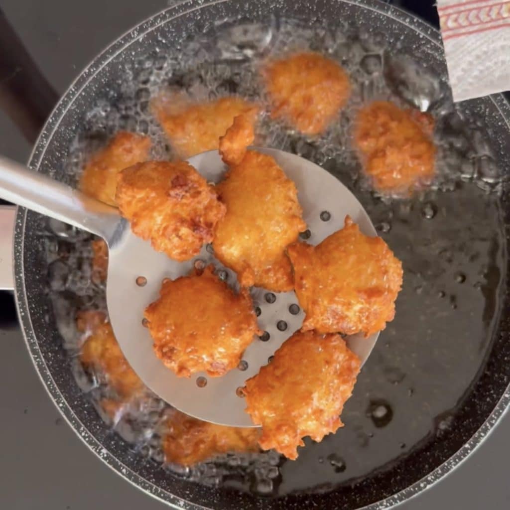 Verwarm de arachideolie tot een temperatuur van ongeveer 170 °C, als je geen thermometer hebt om te controleren wanneer de temperatuur geschikt is om te frituren, gebruik dan een houten lepel. Dompel de steel in de olie en als er belletjes omheen ontstaan, is de olie klaar voor gebruik. Neem met een theelepel het deeg en laat het in de hete olie vallen, met behulp van de andere theelepel om het los te maken. Maak meer fritten maar niet te veel, anders heb je geen ruimte om ze te draaien en garen ze niet gelijkmatig.
