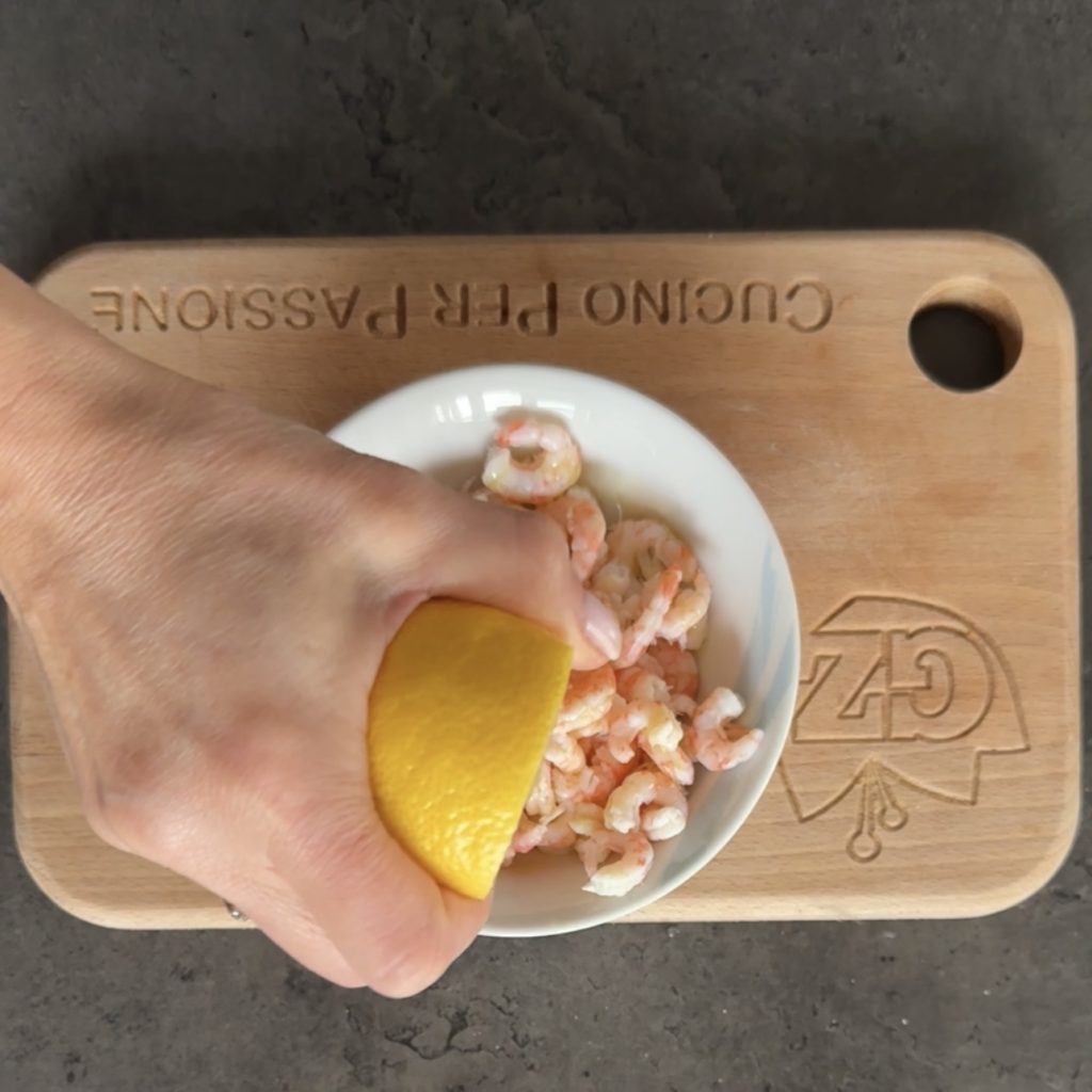 Giet water in een pan, wanneer het begint te koken, zout toevoegen en de garnalen toevoegen, laat ze 7 minuten koken, giet ze dan af en laat ze afkoelen in een kom.