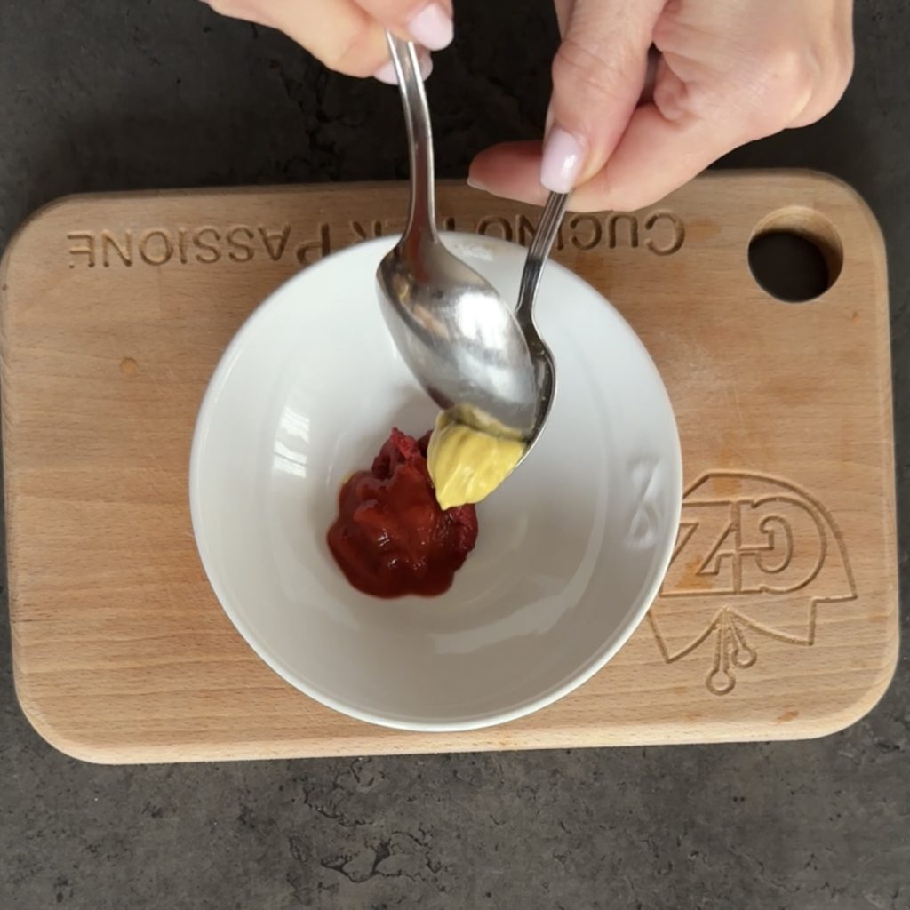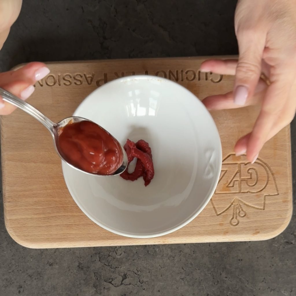 Doe de tomatenpuree in een kom, voeg ook de ketchup toe