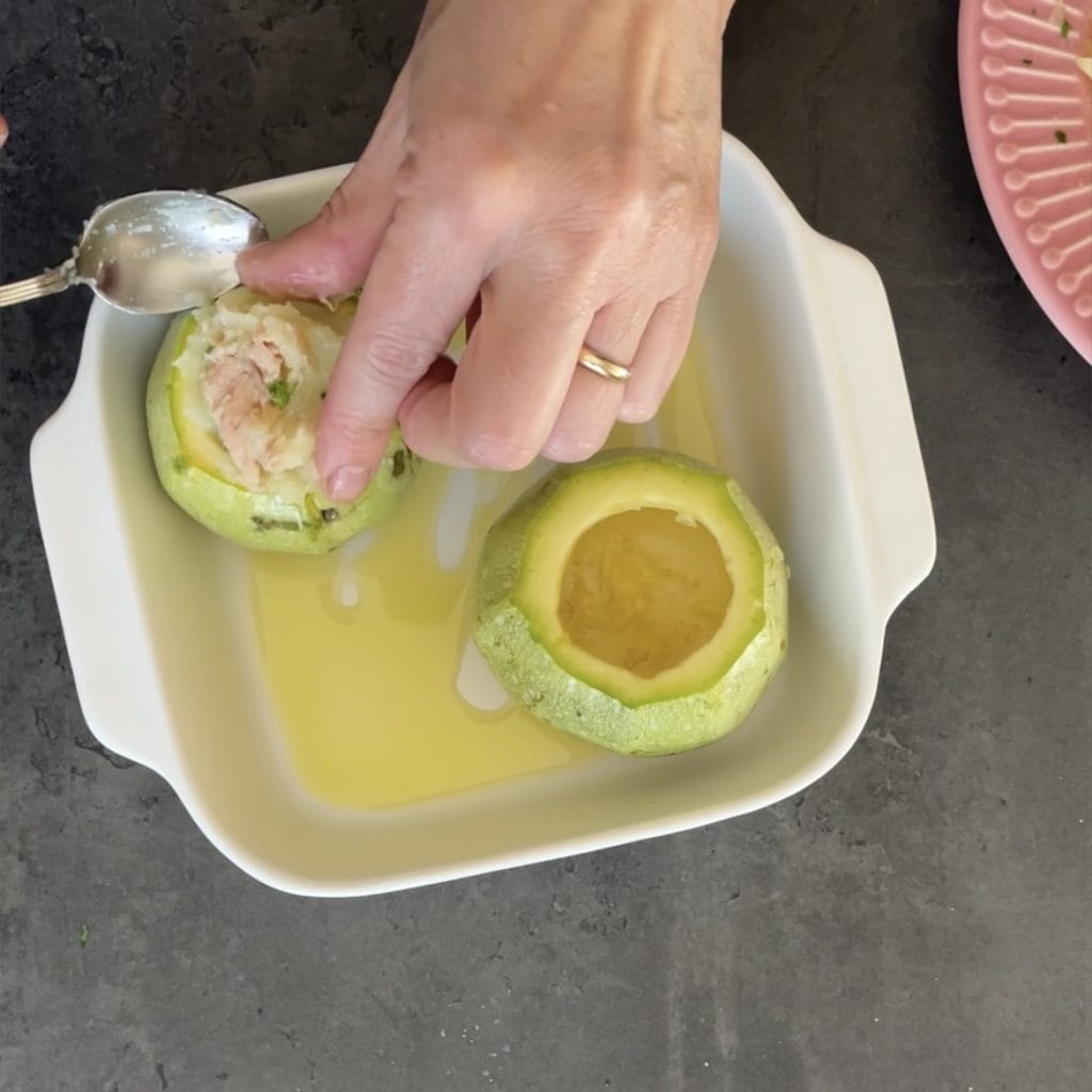 Hoe de ronde courgettes gevuld met tonijn te bereiden