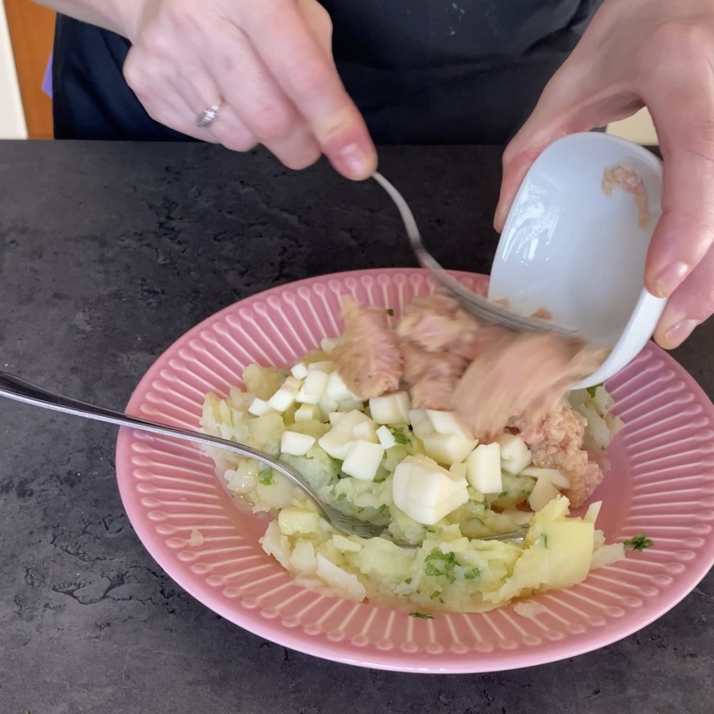 en vul ze met de vulling van aardappelen en tonijn.