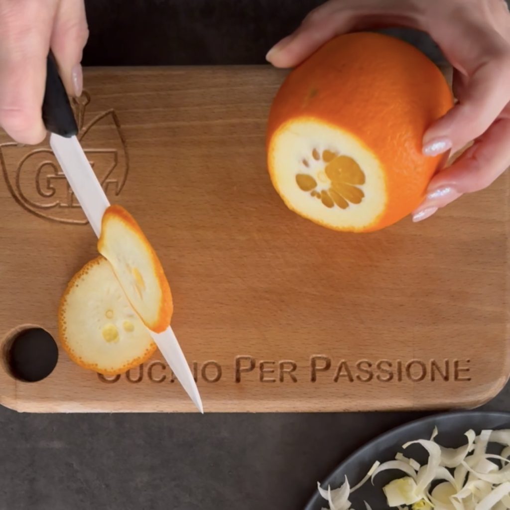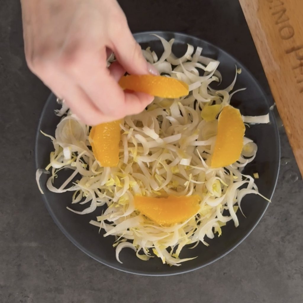 Laten we beginnen met het bereiden van de Salade met Belgische witloof. Was de sinaasappel goed, neem met een dunschiller een deel van de schil, zorg ervoor dat je het witte deel niet meeneemt omdat het bitter is,