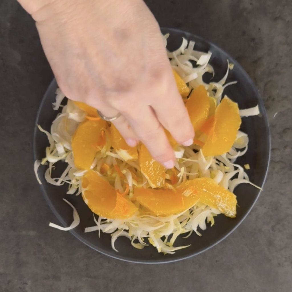 Schik vervolgens de sinaasappelpartjes à vif bovenop de Belgische witloof,