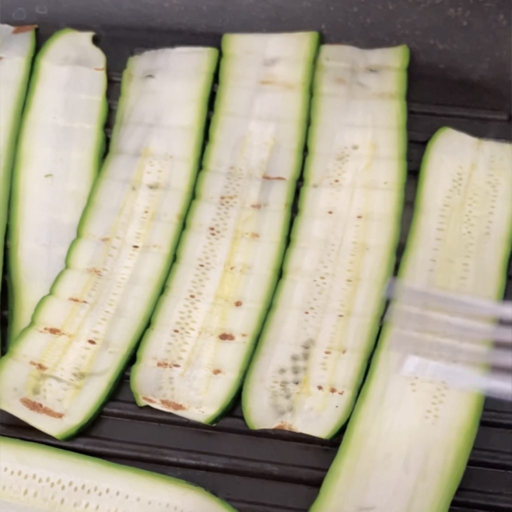 Verhit de grillpan en als deze goed heet is, leg dan de courgettes erop en bak ze aan beide kanten.