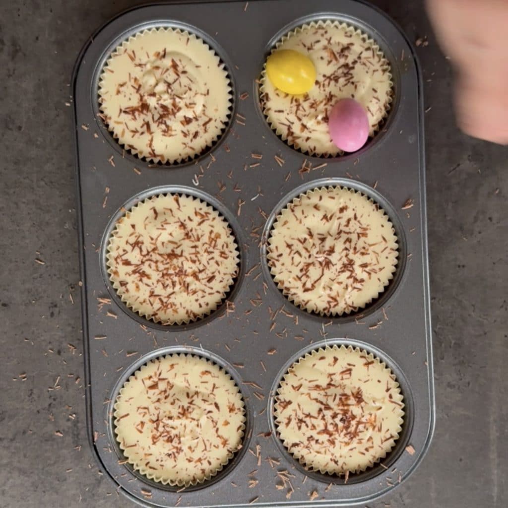 • Zet papieren vormpjes op de muffinvorm en voeg de koekjes toe, druk ze goed aan met de achterkant van een theelepel zodat ze goed compact zijn.