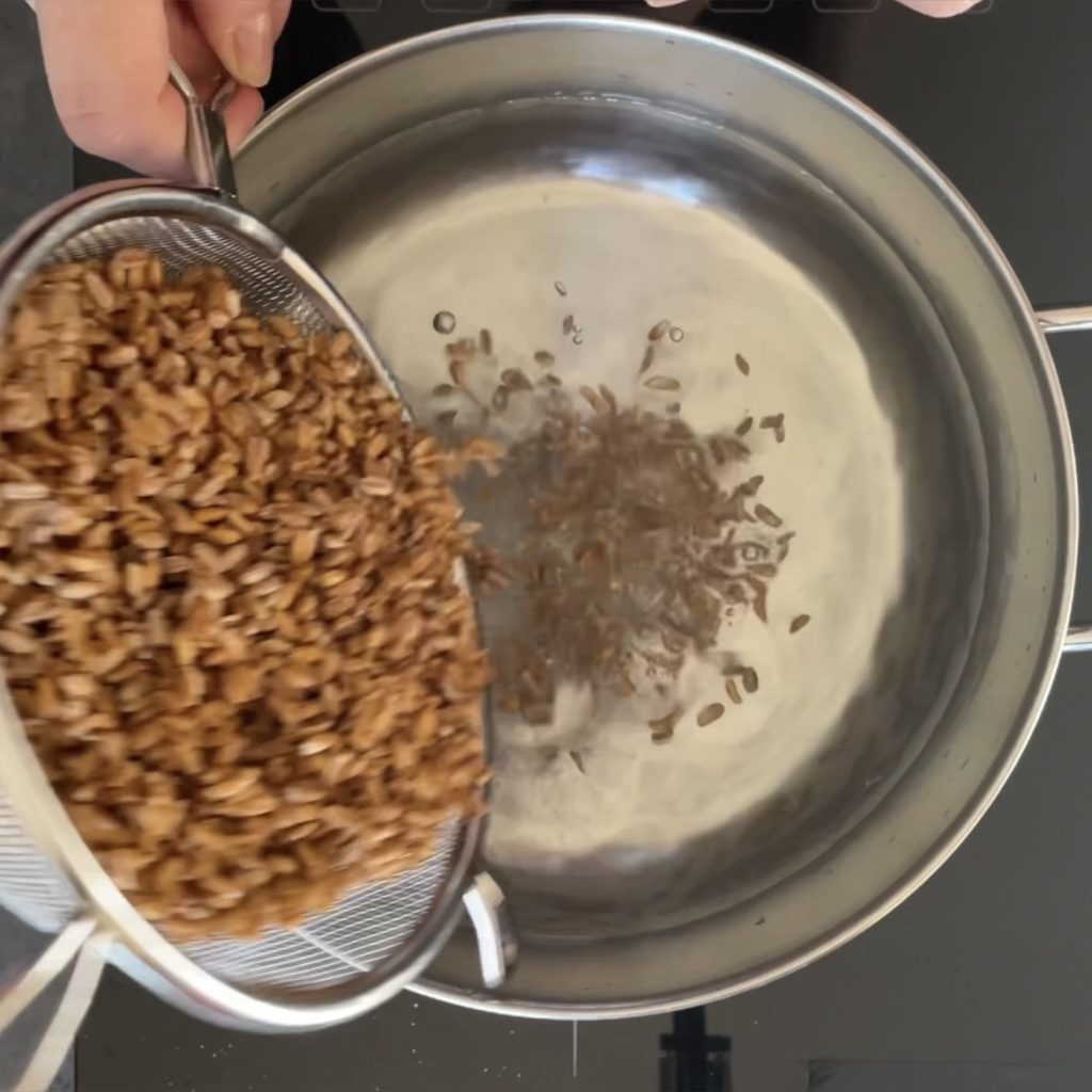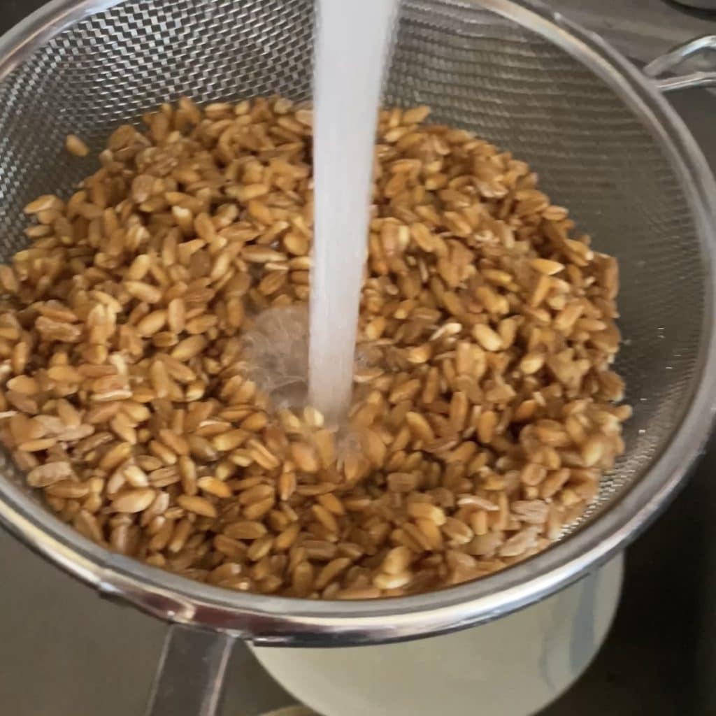 We beginnen met het bereiden van de spelt salade met garnalen, spoel de spelt af onder stromend water,