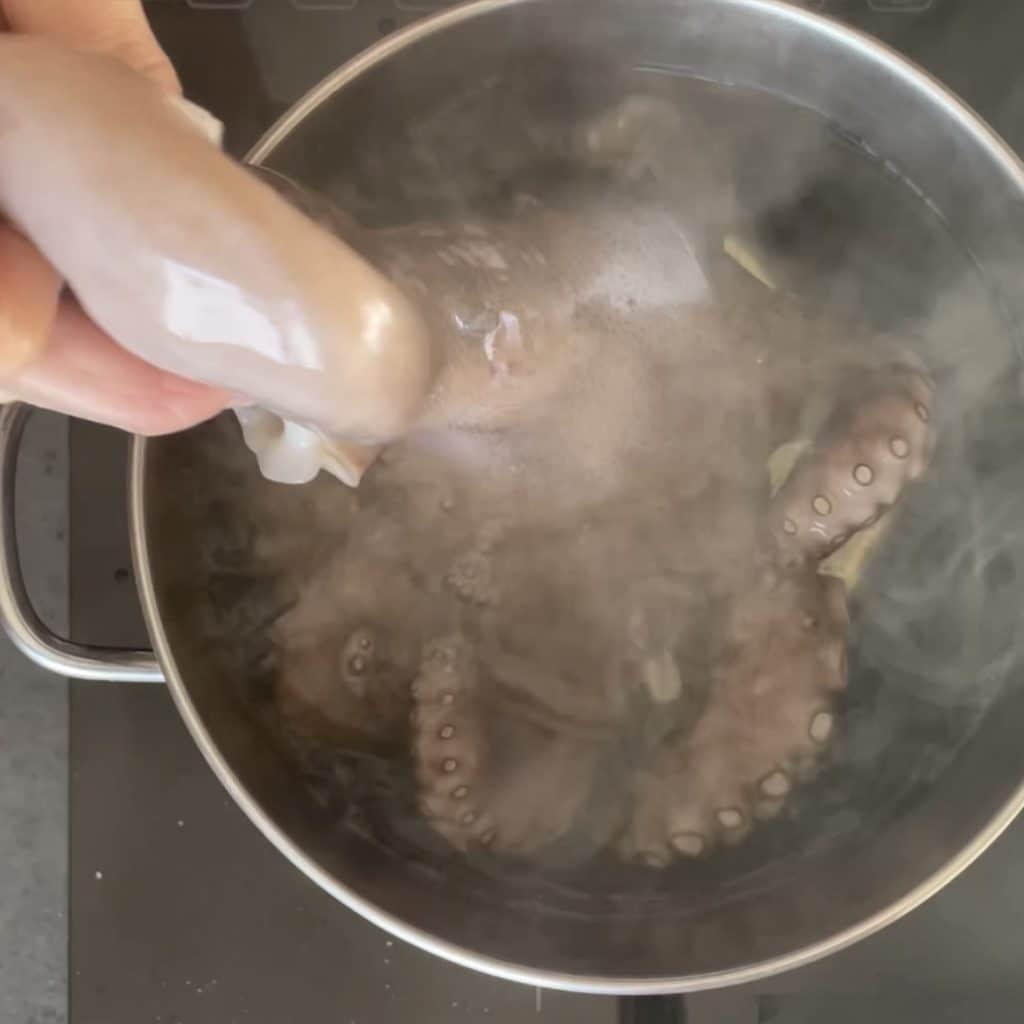 Maak de octopus schoon, verwijder de ogen en de snavel, en was het grondig onder stromend water. Voordat u de octopus volledig in kokend water dompelt waaraan u ook 2 laurierblaadjes hebt toegevoegd, laat de tentakels krullen door de octopus meerdere keren op en neer te bewegen, terwijl u hem bij de buik vasthoudt. Als de tentakels eenmaal gekruld zijn, dompel het volledig in het kokende, gezouten water en kook het ongeveer 40 minuten, de tijd kan variëren afhankelijk van de octopus, controleer de gaarheid door met een vork te prikken, als de tanden er gemakkelijk ingaan, is het gaar.