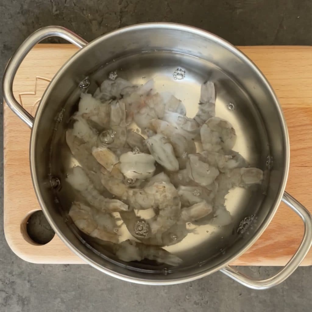 Maak de garnalen schoon, verwijder de schaal, snijd de rug in en verwijder met een tandenstoker het zwarte draadje en spoel ze af onder stromend water.