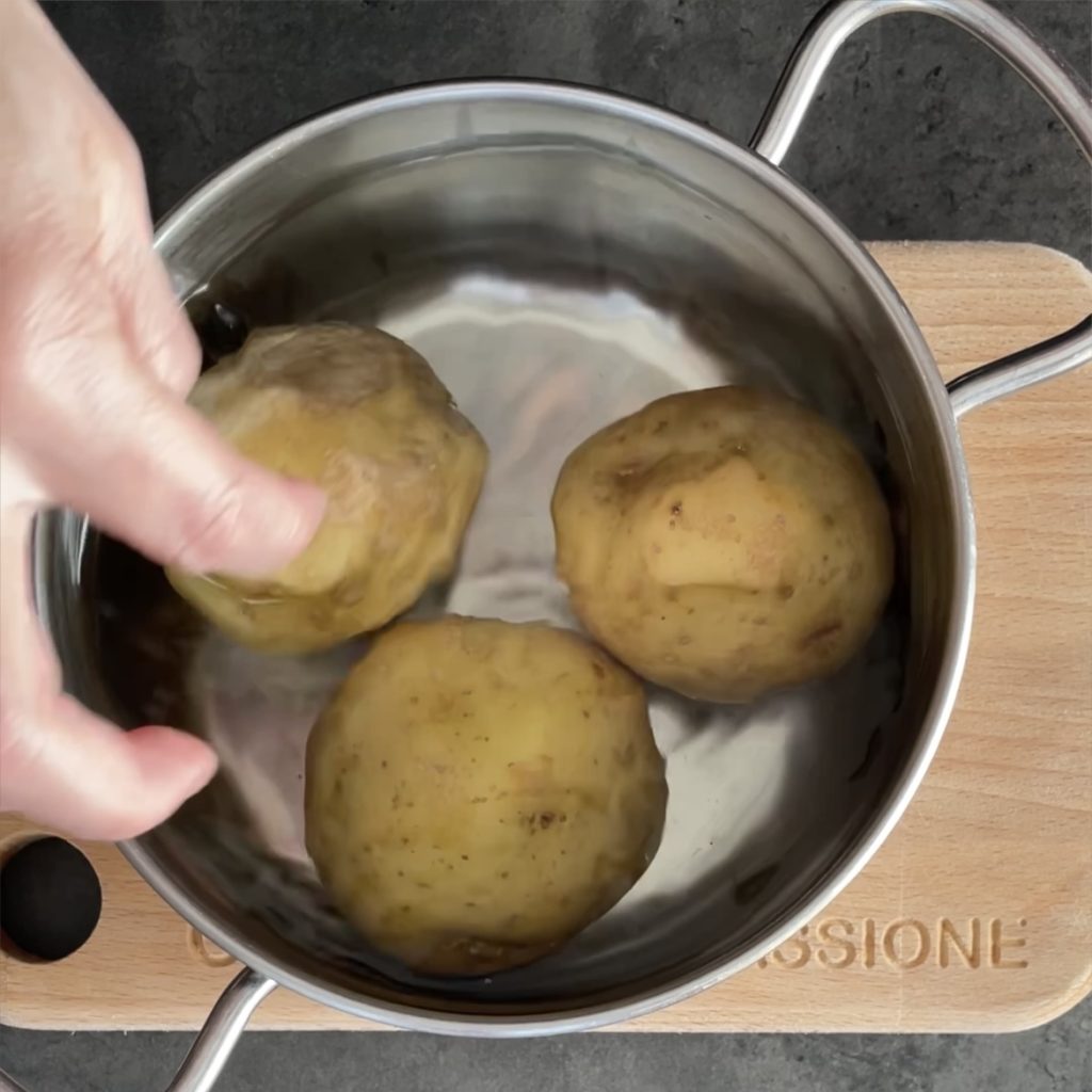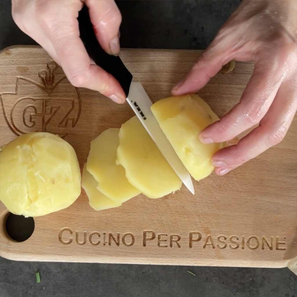 Wanneer de aardappelen gaar zijn, schil ze en snijd ze in plakjes.