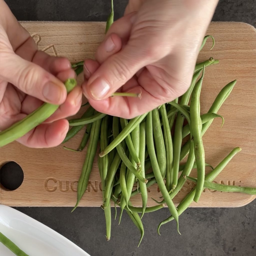 Snijd de uiteinden van de sperziebonen en was ze goed onder stromend water. Doe ze in een pan met koud en licht gezouten water en kook ze gedurende 10 minuten vanaf het moment dat het water kookt. Als je een snelkookpan gebruikt, kook ze dan gedurende 5 minuten vanaf het moment dat het begint te fluiten, schakel daarna uit en laat de druk ontsnappen voordat je de deksel opent, giet ze af en laat ze afkoelen.