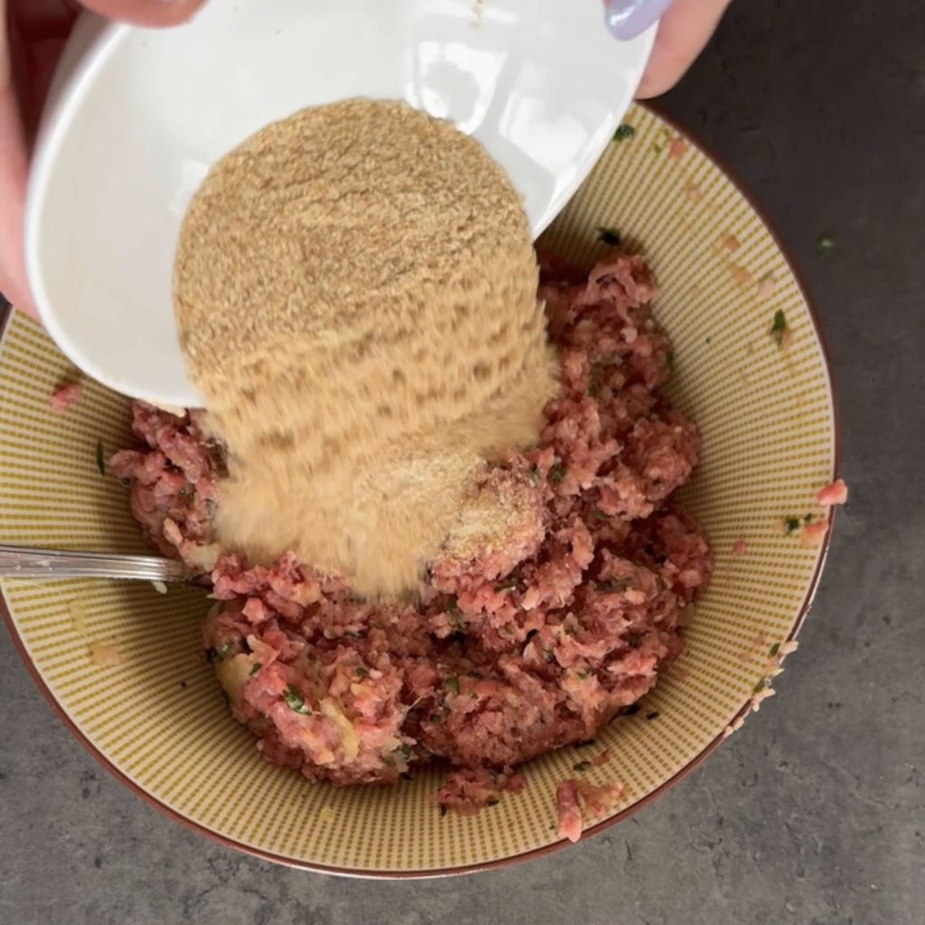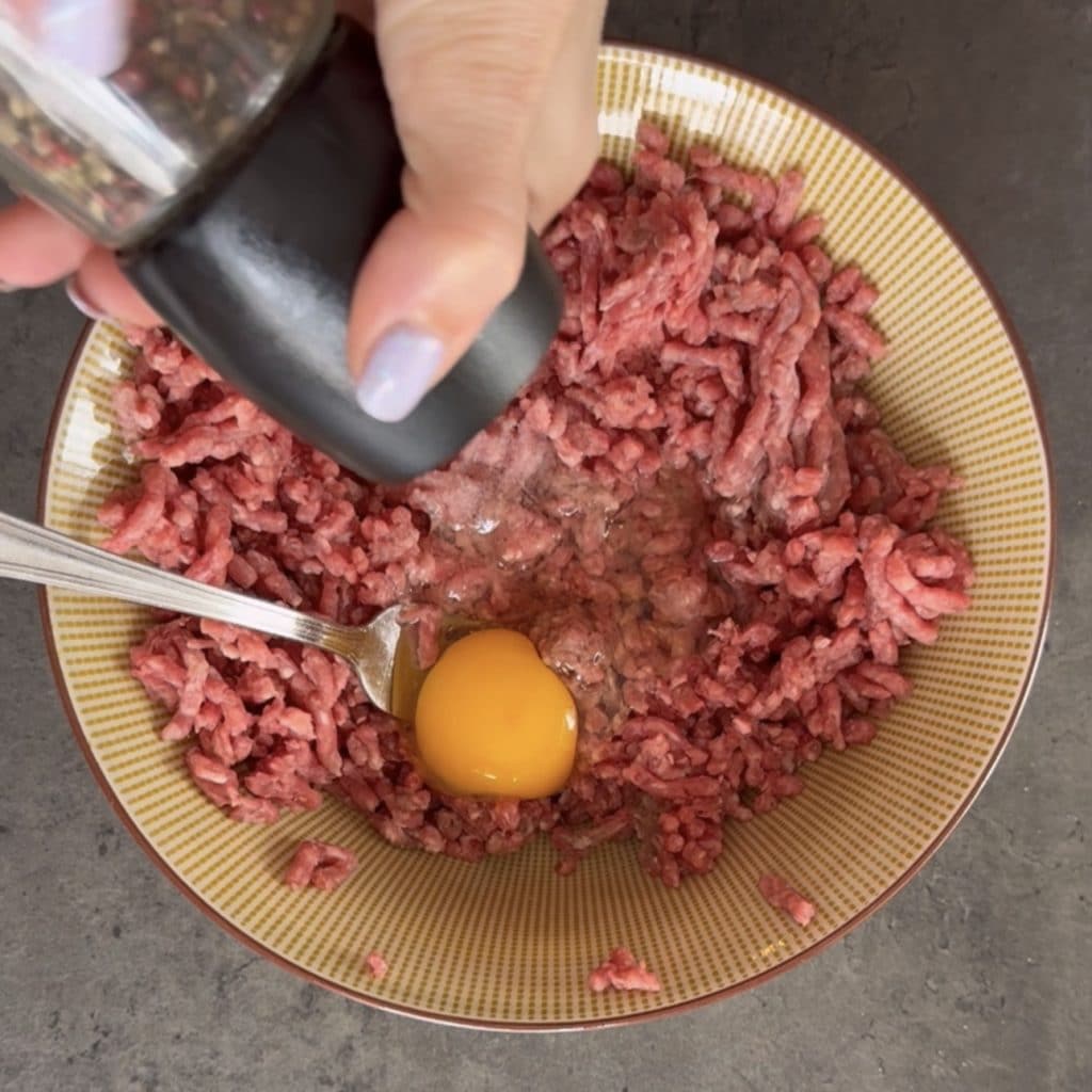 • Doe het gehakt in een kom en werk het los met een vork. Voeg dan het ei toe,