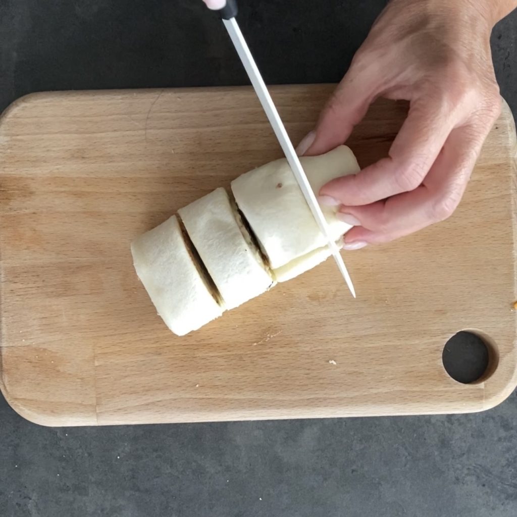 • Na het rusten, snijd elk rolletje in 4 delen.