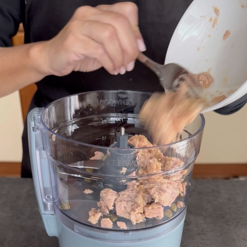 • We beginnen met het maken van de tonijn en groenten sandwichrolletjes, doe de kappers in de beker van de hakmolen,