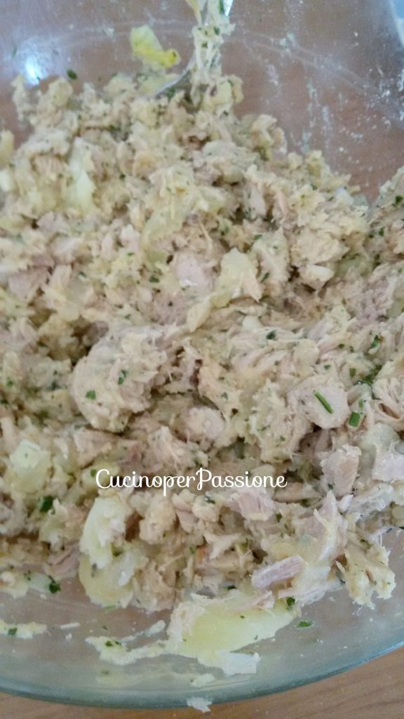 • Doe het mengsel vervolgens in een blender en mix het een paar minuten, of je kunt met veel geduld de tonijn en aardappelen met een vork fijnprakken. Voeg dan de peterselie, eieren, een theelepel gemberpoeder of geraspte verse gember, de fijngehakte ui, chilipoeder naar smaak toe en breng op smaak met zout en peper, meng goed tot je een homogeen mengsel krijgt.
