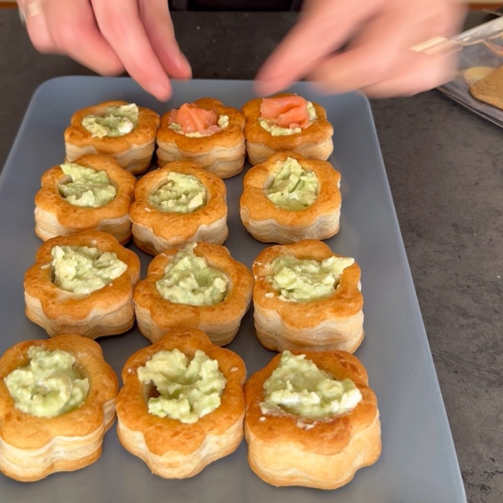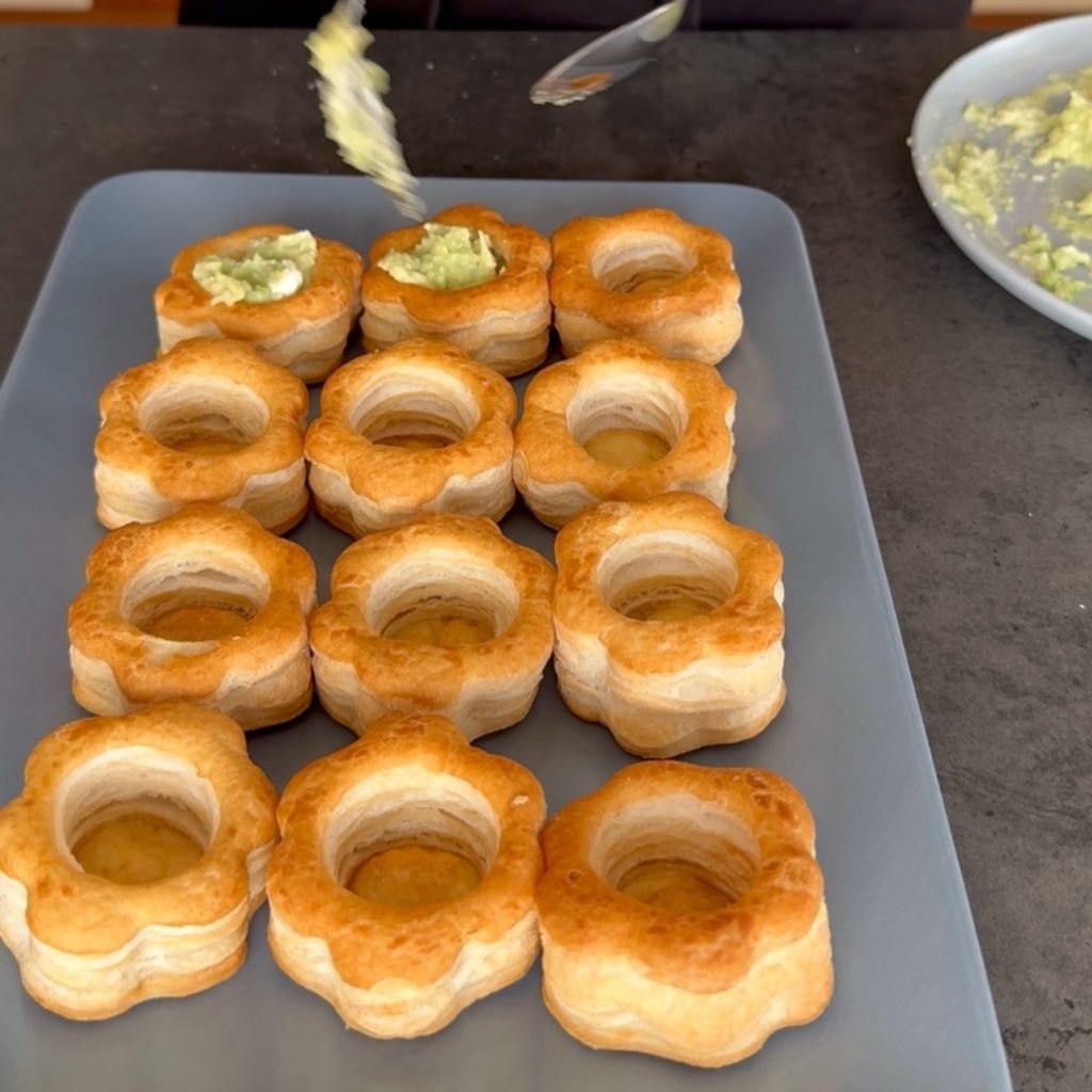 Plaats de vol au vent op het serveerschotel of een dienblad en vul ze met de avocado crème.