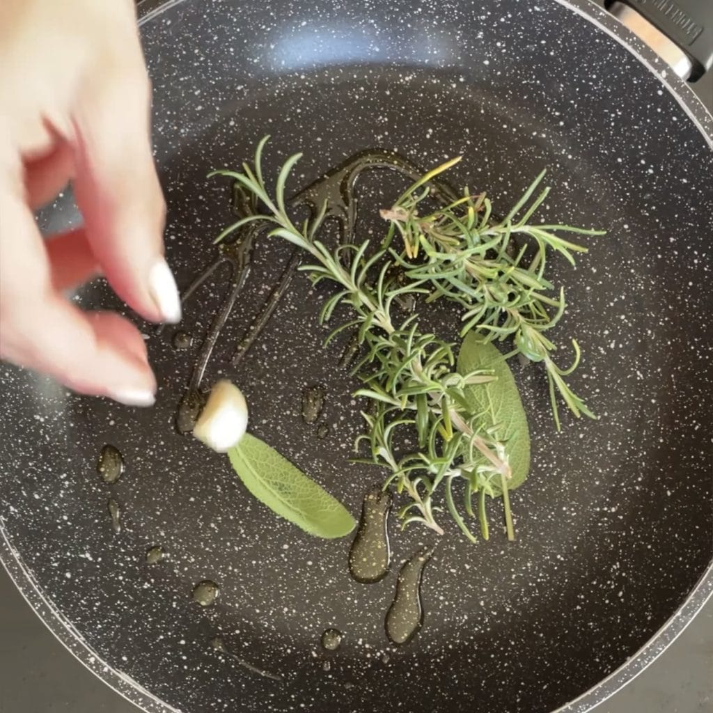 voeg dan de rozemarijn, salie en teen knoflook toe en laat enkele minuten intrekken.